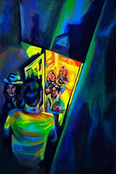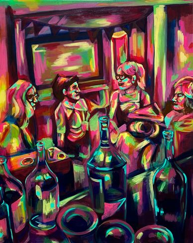 They recount a tale of betrayal, looking through the glass bottles I watch them laugh. It's absurd that we're even here, so in the end we laugh together.